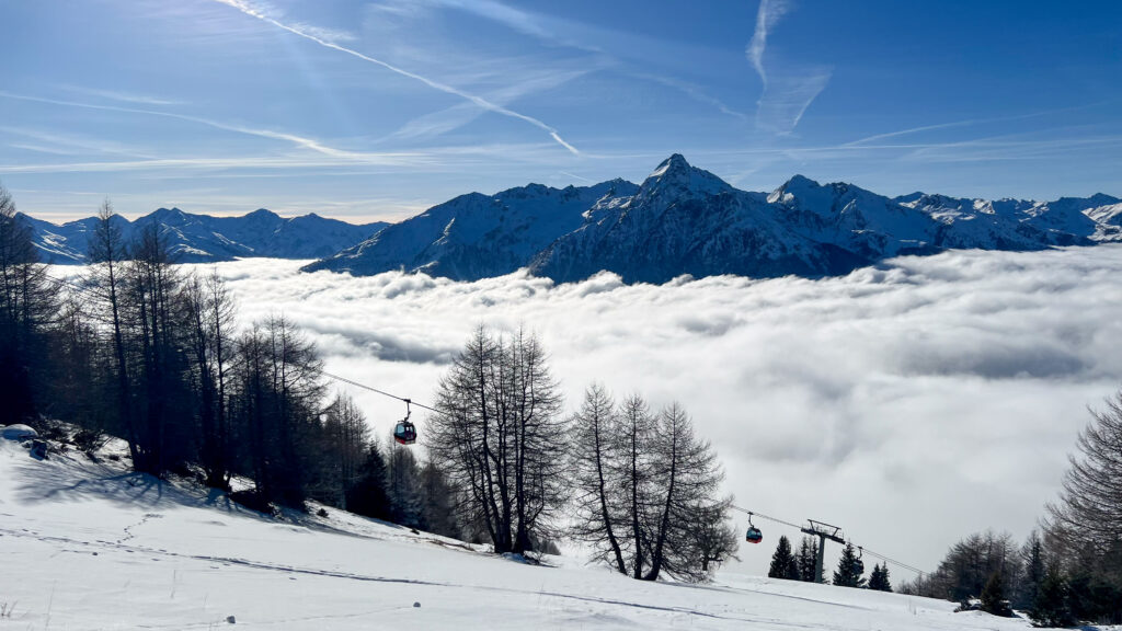 Im Laufe der Woche fuhren wir in alle Bereiche des Skigebiets und nutzten die guten Bedingungen mit Sonne und Schnee und freien Pisten intensiv. Dabei nahmen wir natürlich immer die erste Gondel des Tages.