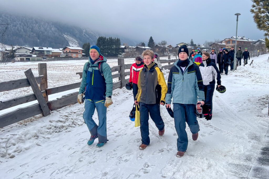 Am Sonntag begann für viele der erste Skitag ihres Lebens. Das Wetter zeigte sich zunächst wenig entgegenkommend: Schlechte Sicht und grauer Himmel erschwerten einerseits den Einstieg, anderseits sahen die Schülerinnen und Schüler, die im letzten Jahr schon dabei waren, auch nicht, welche „wilden“ Pisten die Skiguides sie direkt schon wieder runterjagten.