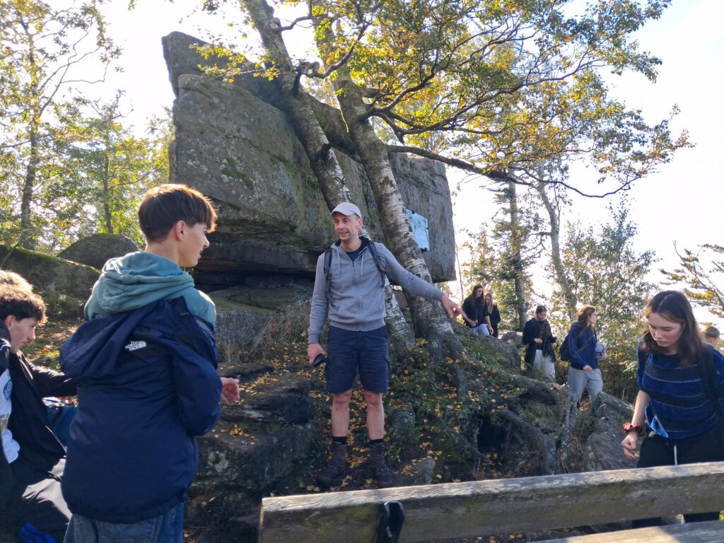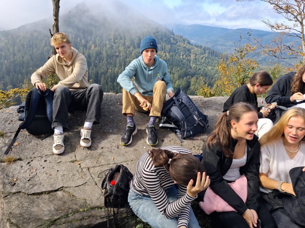 Am Dienstag fuhren wir erneut in die Vogesen, dieses Mal begleitet von 2 Geschichtslehrern. Ziel war eine historische Wanderung entlang einer Frontlinie des 1. Weltkriegs. Dieser etwas bedrückende Teil wurde jedoch mehr als kompensiert, als wir auf dem Gipfel des Donon mit einem unfassbar schönen Rundumblick auf die Vogesen unser Picknick machten. Abgerundet wurde dieser letzte Tag mit einem gemeinsamen Abschlussessen im Park, wo jede Gastfamilie etwas zum gemeinsamen Buffet beigetragen hat. Am Mittwochmorgen hat diese erlebnisreiche Woche in Frankreich ein Ende genommen und nicht wenige Tränen waren in den Augen, als die Corres sich von ihren Familien verabschiedet hatten. Die ohnehin schon lange Fahrt wurde durch einen Oberleitungsschaden um einen 2-stündigen Aufenthalt in Karlsruhe verlängert…